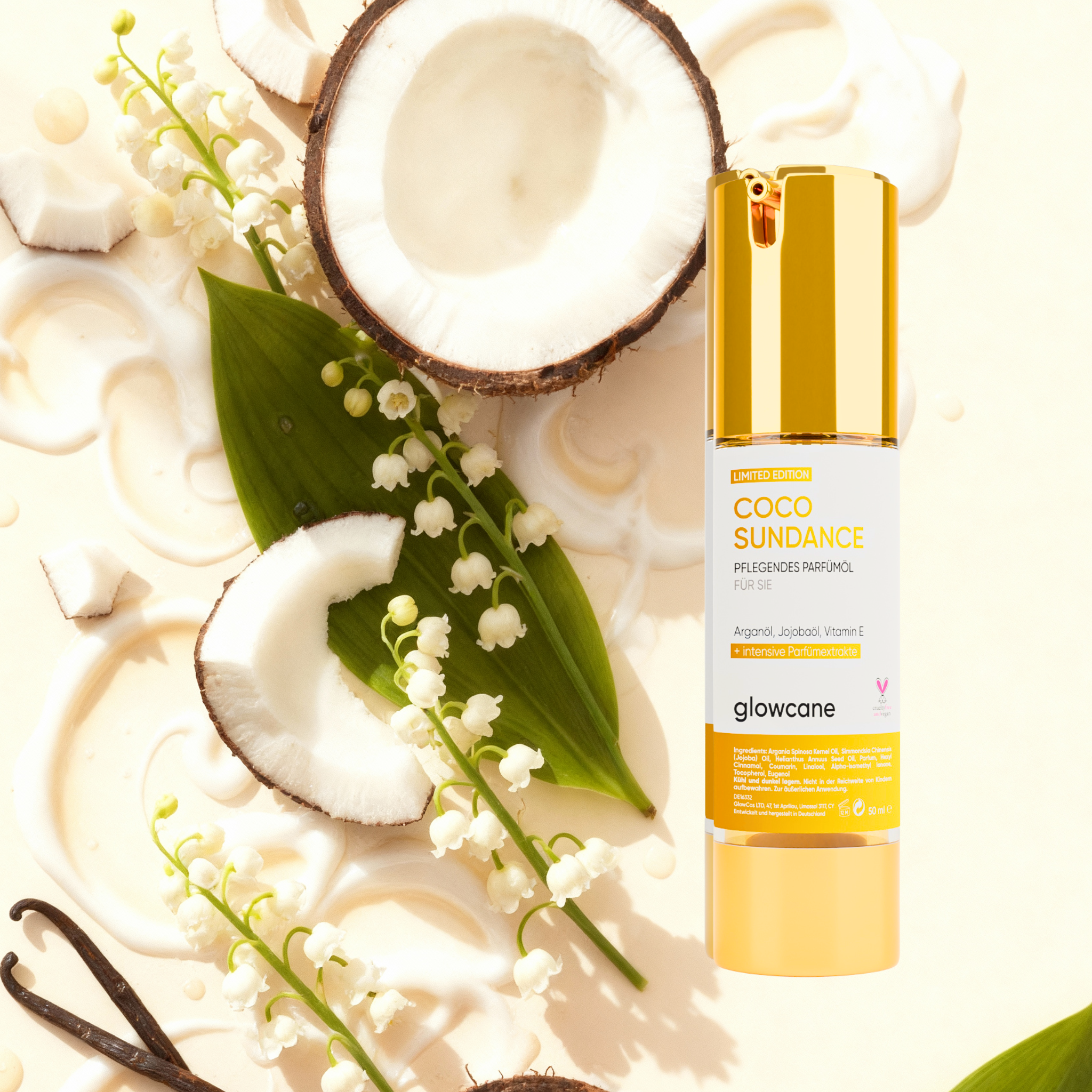 Warmer Kokos Vanille Traum in unserer einzigartig pflegenden Parfüm-Formel. Angereichert mit intensiven Parfümextrakten für einen länger anhaltenden Duftschweif. Auf Basis 100 % natürlicher Pflegeöle.