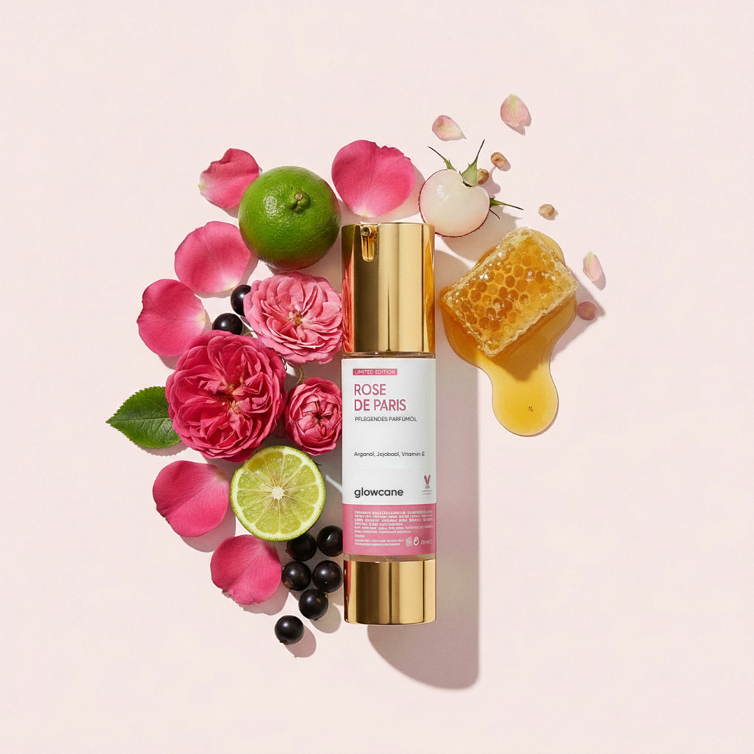 Rose de Paris als einzigartig pflegende Parfüm-Formel. Angereichert mit intensiven Parfümextrakten für einen länger anhaltenden Duftschweif. Auf Basis 100 % natürlicher Pflegeöle.