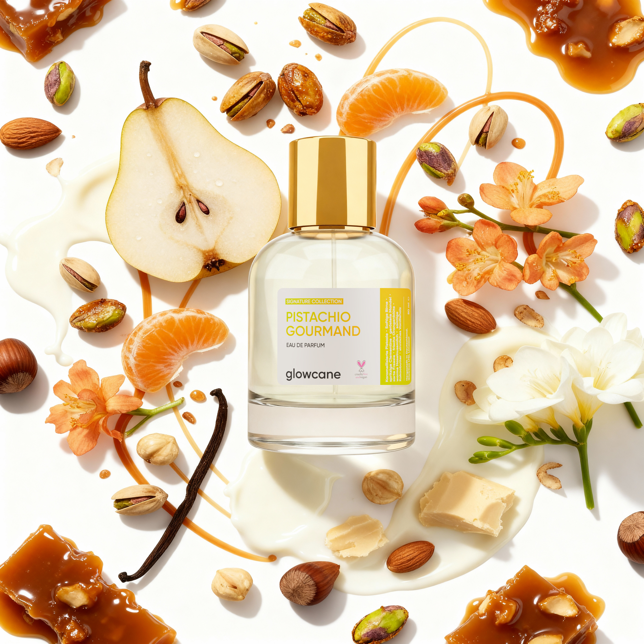 Pistachio Gourmand bringt wohlige Wärme wie ein kuscheliger Abend bei Kerzenlicht. Karamellisierte Pistazie, Birne und Clementine treffen auf Mandel, Freesie und Orangenblüte. Haselnussmilch, Kakaobutter und Vanilleholz runden den Duft cremig ab.